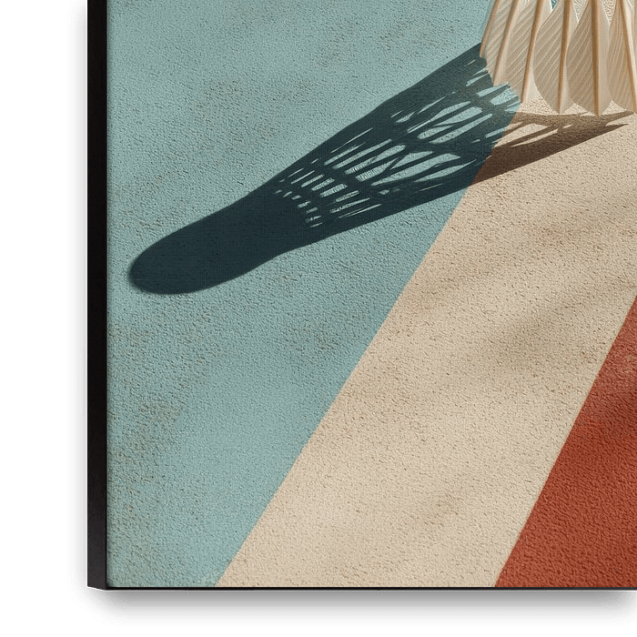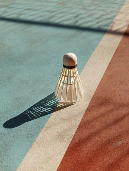 A badminton shuttle stands upright in bright sunlight, its shadow sharply delineated on the court. The fragile object contrasts with the hard surface. The image captures a moment of absolute stillness.