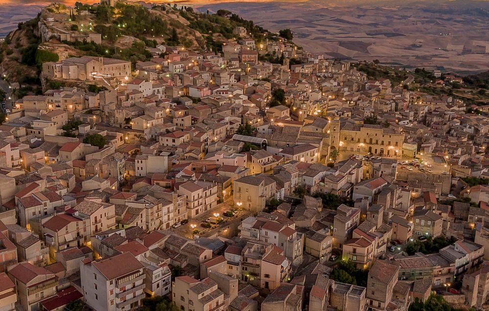 Assoro, klein dorpje in de binnenlanden van Sicilie op een berg, gefotografeerd met een drone tijdens een zonsondergang..