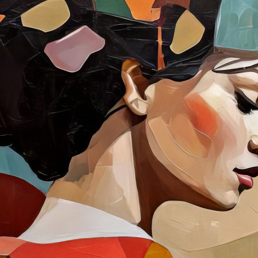 I made two versions of this painting; this is the second, more refined design. In this work, I took an abstract but finer approach as in the first. The young woman is rendered both recognisably and artistically. The model is painted askew from behind, but her face is clearly visible from the side, creating an intriguing contrast between movement and tranquillity.
