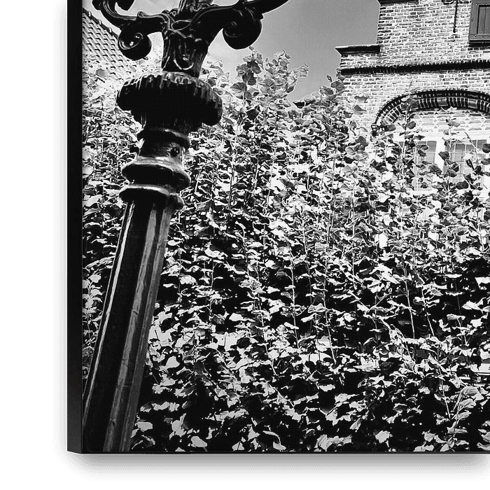 This black-and-white photograph captures an enchanting moment in a historic European street scene. An ornate lamppost towers dramatically in the foreground, while a characteristic stepped-gabled red-brick house stands stately in the background. The dramatic angle of the shot and the play of light and shadow bring a sense of nostalgia…