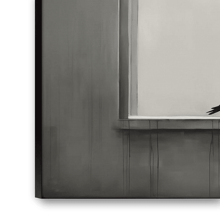 A poetic black-and-white artwork in which a human sits next to birds on a windowsill. The minimalist composition emphasises stillness, impermanence and reflection.