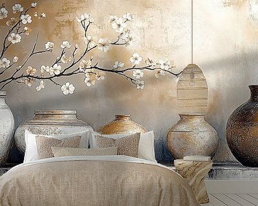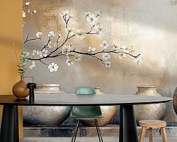 This artwork shows a silent but fascinating beauty of earthenware vases and a sprig of soft pink cherry blossoms. The rough but warm materials and tones of the vases form a beautiful contrast with the fragile but lively blossoms - a metaphor for the transience of nature and the sustainability of art.