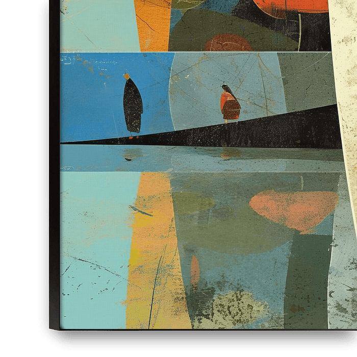 Silent Harmony Shapes - This abstract painting is characterised by the complex composition of geometric and organic shapes, dominated by shades of blue and beige, and accentuated with striking orange and red elements.