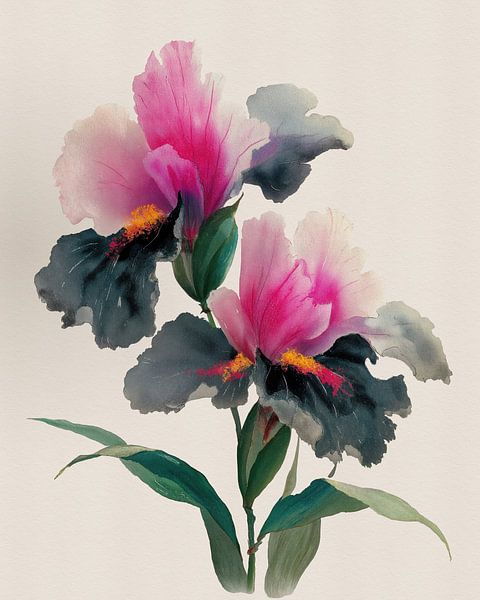 A delicate illustration of blooming irises, blending soft pink petals with deep inky shadows, rendered with airy washes and an elegant, minimalist feel