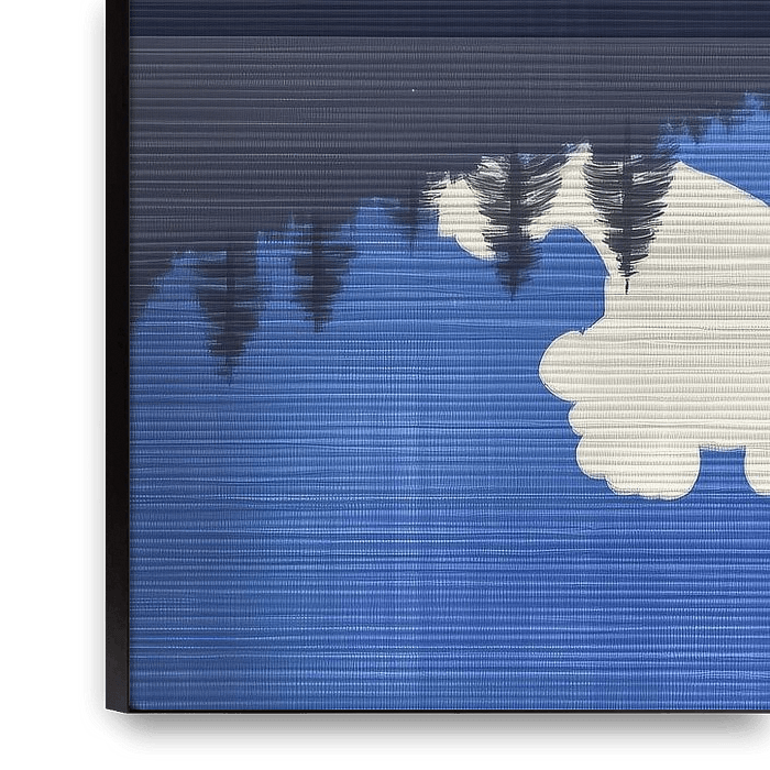 This graphic mountain landscape plays with symmetry and reflection. Mountains and trees are reflected in a still water surface, creating a powerful yet serene composition. The combination of deep blues with warm red accents gives the work a modern, almost iconic feel.