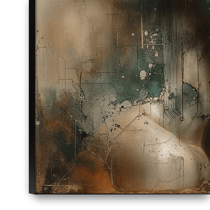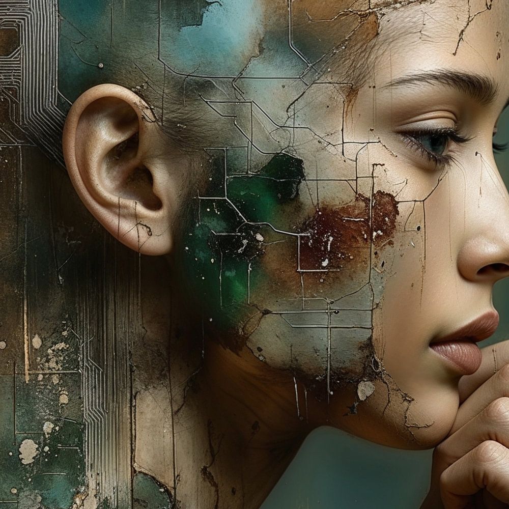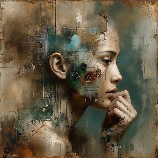 The style is a fusion of realism and abstract art, with a focus on earthy tones such as browns, blues and greens. The background consists of a mix of hazy, painterly textures, which enhance the ethereal and futuristic feel of the composition.