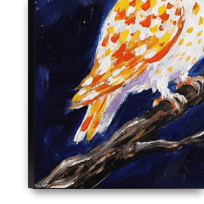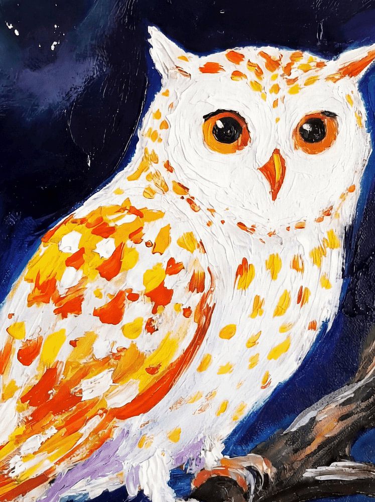 A serene illustration of a white owl with warm orange patterns perched on a bare branch under a deep blue night sky. The moonlight and textured brushstrokes create a calm yet mysterious atmosphere, making this artwork ideal for elegant wall decor and quiet spaces.