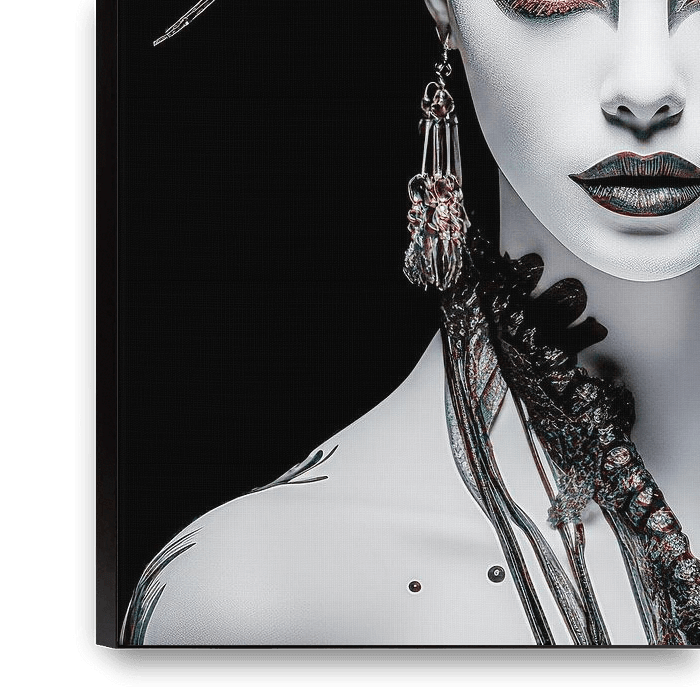 This portrait of the "Silent Warrior of the Night" is an extraordinary depiction of a majestic yet terrifying figure. Her snow-white face, which appears like a blank canvas, is framed by intense black lines that sharply emphasise the contours of her eyes and give her a profound, almost unearthly expression. The warrior wears a delicate…