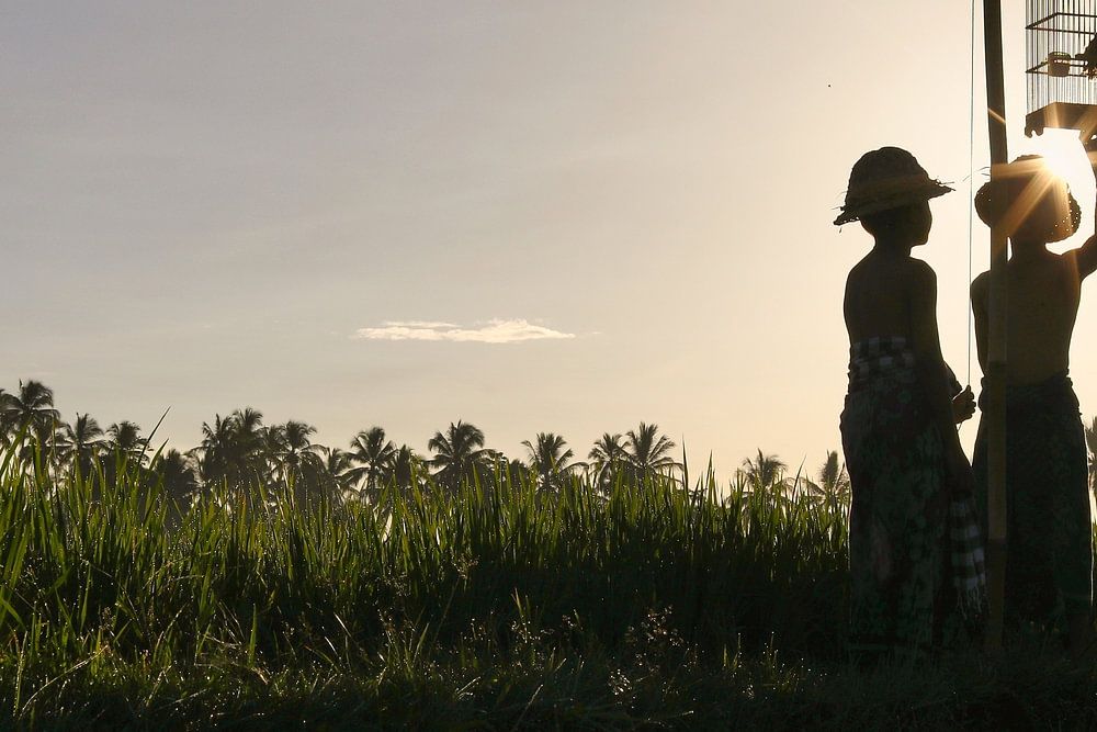 The image shows the beauty of the island of Bali. The warmth of the colors in the sky, the stunning rice field and the little details of the caged bird. The silhouette adds magic to the otherwise pristine sky.
