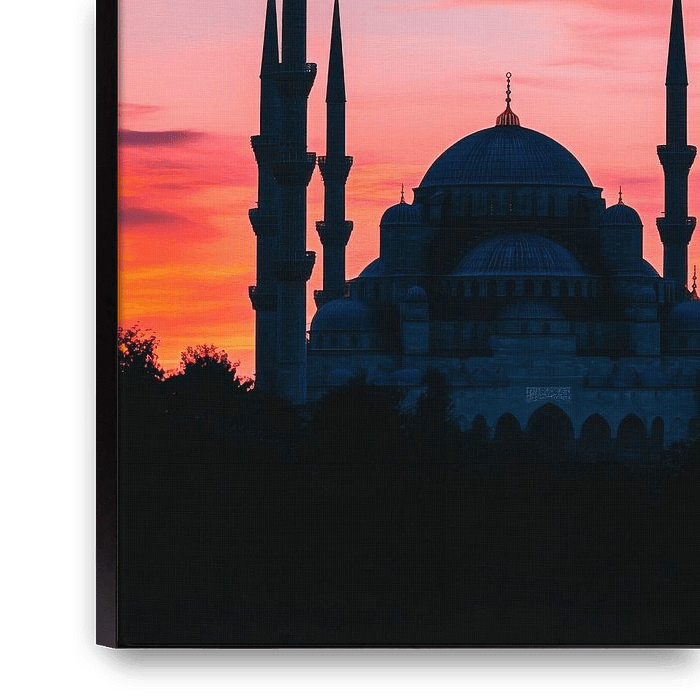 A fascinating interplay of vibrant colours in the evening sky, illuminating the majestic silhouette of a mosque. Its striking minarets reach towards the sky, while the delicate moon watches over them. This artistic motif creates an inspiring atmosphere, ideal for the living room, where it can stimulate conversation and set a meditative…