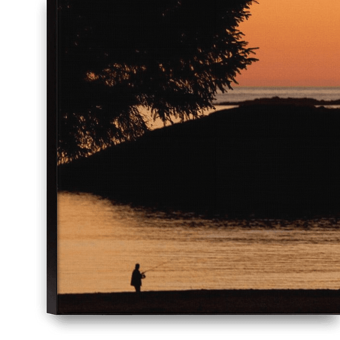 Walking, meditating and fishing at sunset on Vancouvereiland. They are depicted in silhouette with the rocks off the coast and the framing between the trees.