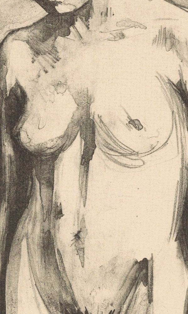 This woman stands naked in a portrait, a nude portrait. As a result, her legs, hips, torso and breasts are exposed in the portrait.