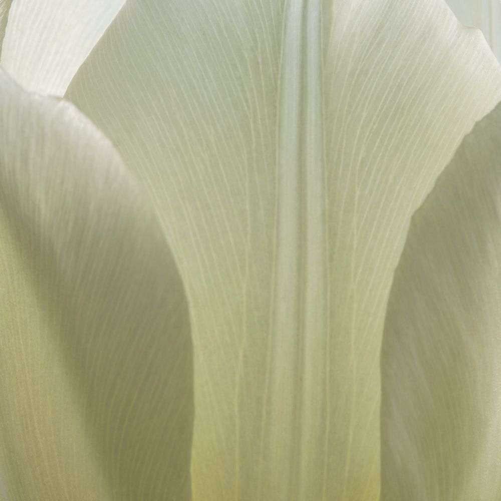 I then let this tulip stand for a while, until the leaves opened up a little more. I did this because I think it makes the shape of the tulip more exciting. And it also allows the light to enter the tulip more easily. Because of this light, the white - cream-coloured petals seem to light up a bit.
