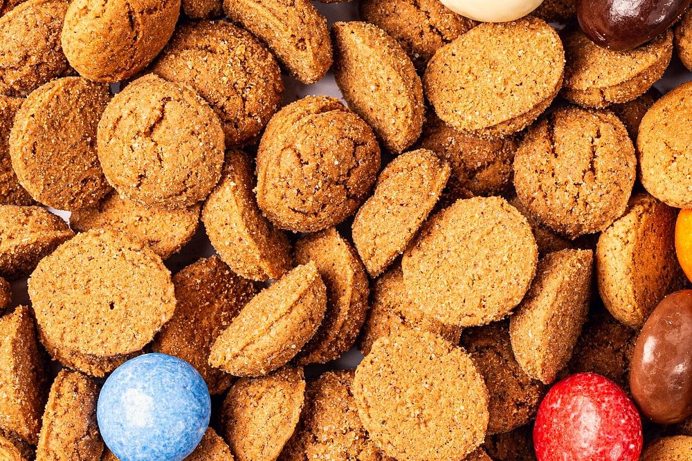 This picture shows traditional Dutch treats known as "kruidnoten" and "pepernoten". Kruidnoten are small, crunchy biscuits made from a mixture of spices such as cinnamon, cloves and nutmeg. Cloves also include coloured chocolate candies that add variety and sweetness. These treats are usually associated with St Nicholas celebrations and are often distributed to children in early December.