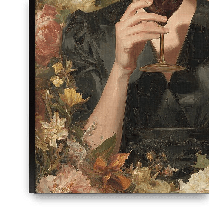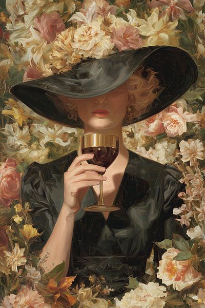 Sip Among Roses - Ze staat er alsof ze net binnenstapt op het moment dat iemand zegt: "Vertel." Een vrouw, in een zwart gewaad en met een hoed zo breed dat hij haar blik verbergt, houdt een wijnglas met gouden rand tegen haar lippen. Het eerste dat je voelt als je naar dit vrouw schilderij kijkt is die scherpe tegenstelling: het matte, diepe zwart van hoed en kleding tegenover de weelderige, lichtgevende massa bloemen die haar omringen. De kunstenaar koos die tegenstelling bewust: donker en geheim versus licht en overvloed, zo wordt het portret tegelijk statig en ondeugend.