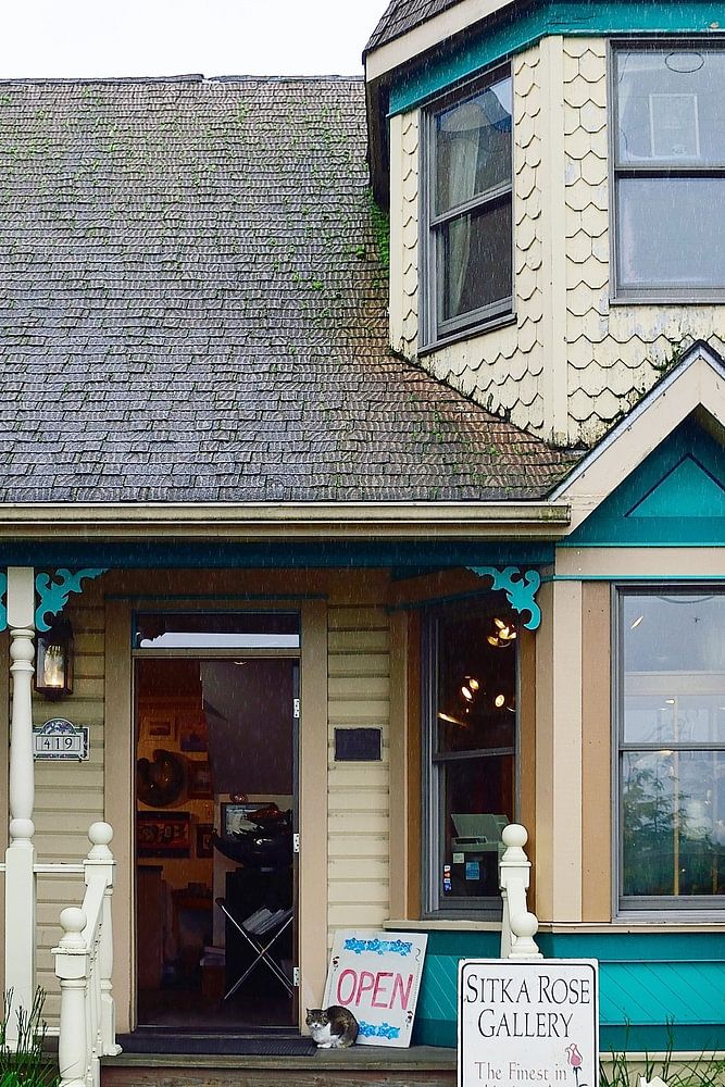 Walking around in the town of Sitka in Alaska, USA. We found it a bit boring to be honest, definitely not a highlight of an Alaska trip. However, there were some nice buildings like the Sitka Rose gallery.