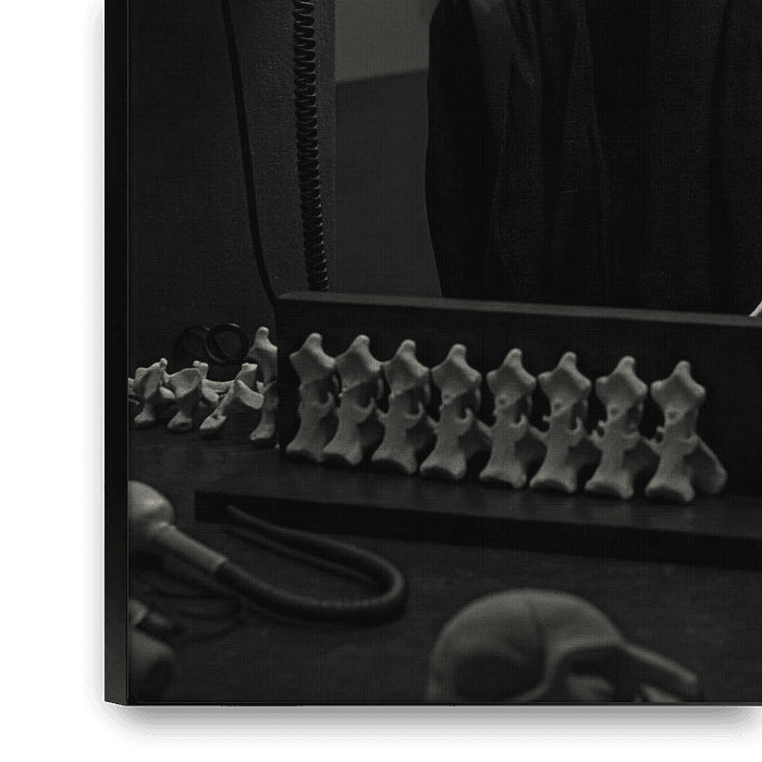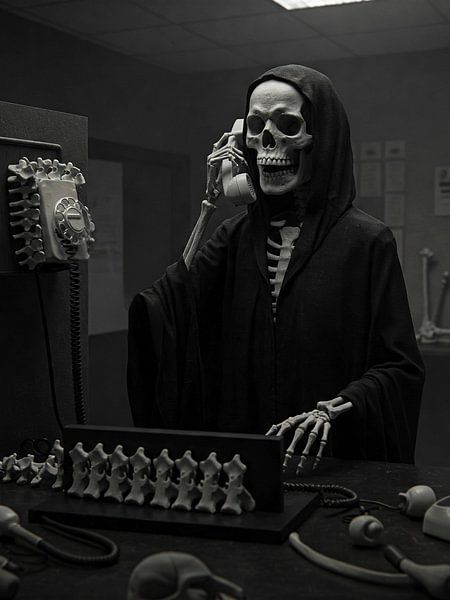 A sharply dressed skeleton sits at an office desk, holding a telephone receiver in a moody, dimly lit interior. The scene blends dark humor with corporate symbolism, suggesting themes of endless work, mortality, and modern pressure. With cinematic lighting and a minimalist composition, this artwork creates a striking balance between…