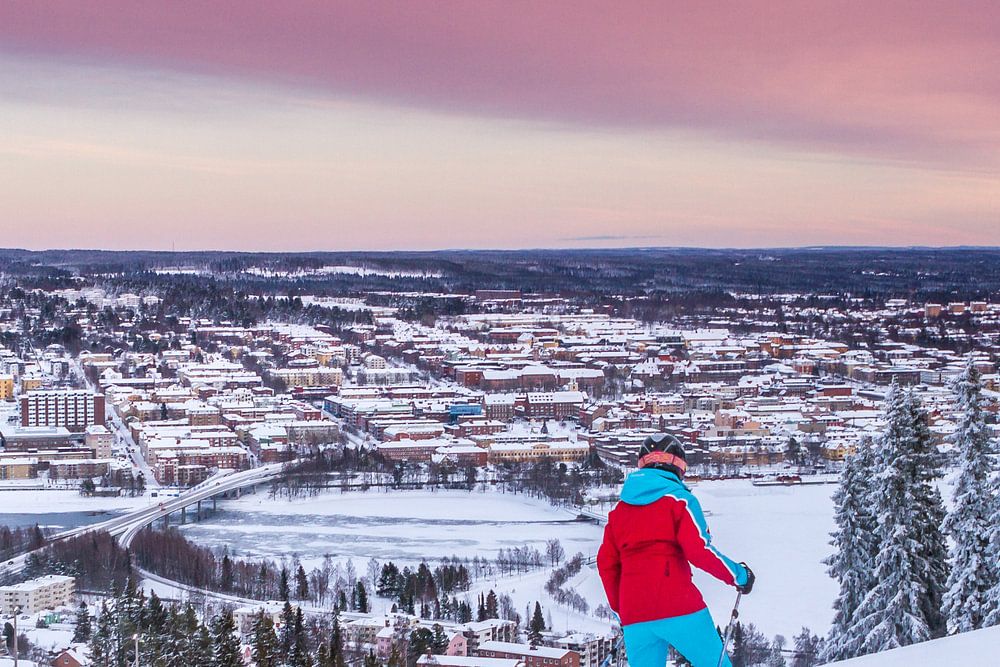 A skier on the mountain in Östersund. Skiing in the middle of the city in the north of Sweden.