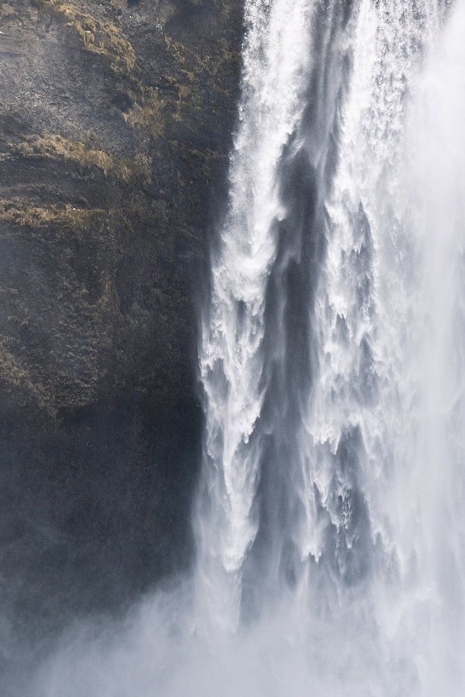 The Skogafoss waterfall in Iceland during a dark day. The white of the wildly flowing waterfall provides a nice contrast to the black rock along it and on the ground.