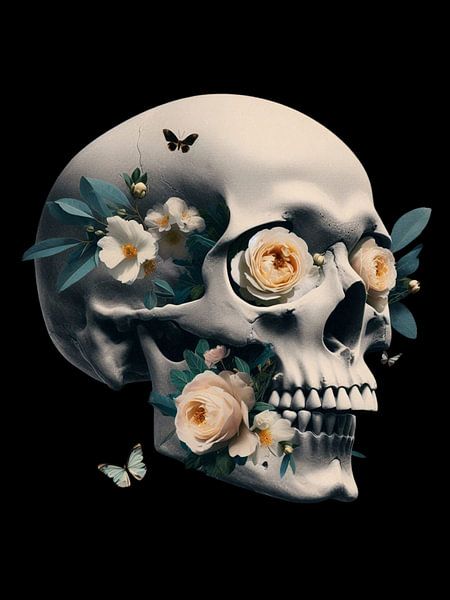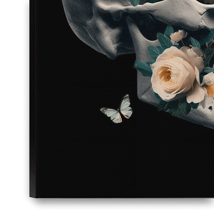 A dramatic skull decorated with soft ivory roses set against a deep black backdrop. The strong visual contrast enhances the romantic yet melancholic mood. This artwork blends gothic symbolism with refined floral aesthetics, making it ideal for modern statement walls.