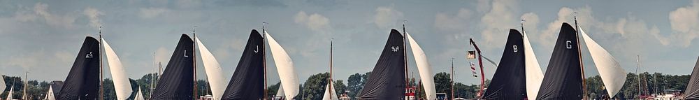 Skutsjesilen, race with flat-bottomed sailing ships near Elahuizen, the Netherlands. Panorama.