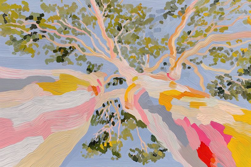 An upward view of a sprawling tree canopy rendered in flowing, textured strokes of pastel pinks, warm yellows, soft greens, and muted blues, blending impressionistic movement with a dreamy contemporary style
