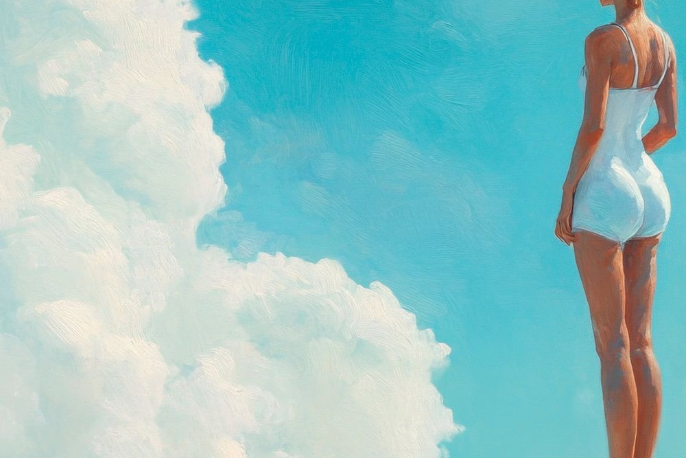 In a dreamlike setting full of cloud structures, a silhouetted figure stands in a radiant white dress as if she were part of the sky. The soft, fluffy clouds seem to group around her, while the open space promises endless possibilities. A feeling of freedom and grandeur permeates the air, a moment between earth and sky.
