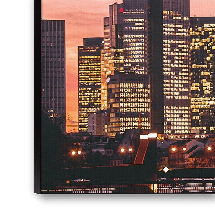 Buy the photo Skyline Frankfurt am Main, pink sky and illuminated skyline by Fotos by Jan Wehnert on canvas, ArtFrame, poster and wallpaper, printed on demand in high quality.
