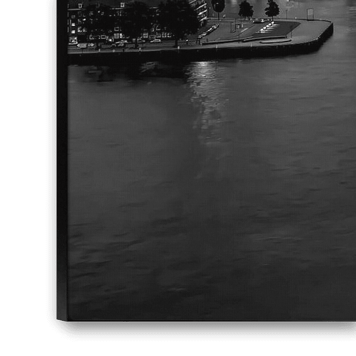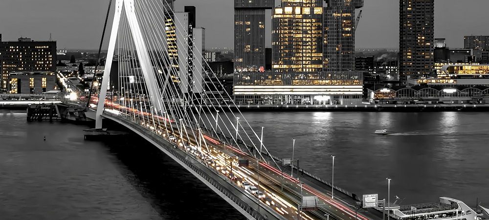 With this photo you will bring a pearl into your home. The typical Rotterdam skyline is determined by, among other things, the Maastoren (highest office building of the BeNeLux), the Erasmus Bridge, De Rotterdam, Montevideo, Cruise Terminal, Hotel New York, etc., etc.