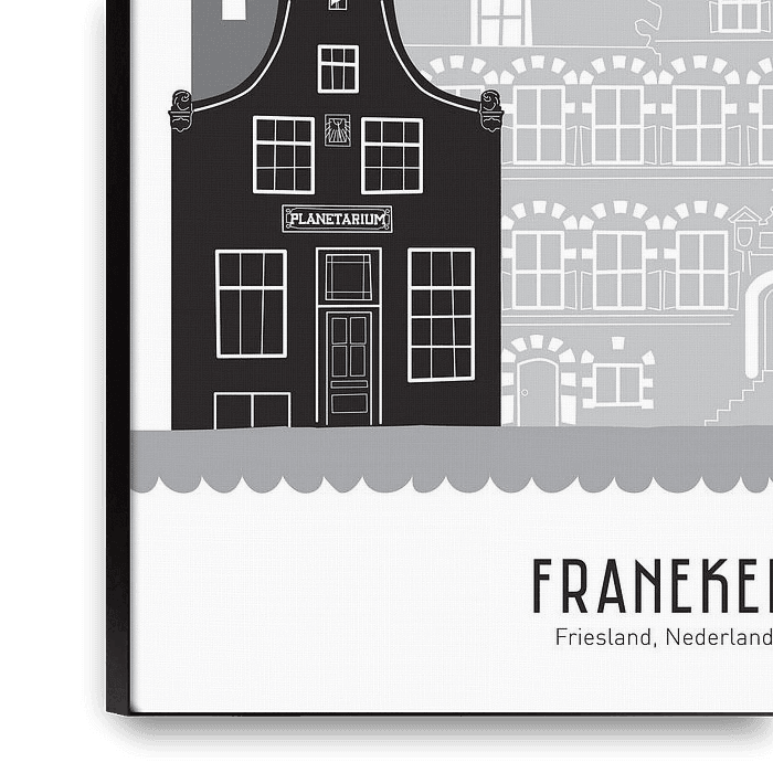 Buy this illustration Skyline illustration city of Franeker in black-and-white-grey by Mevrouw Emmer on canvas, ArtFrame, poster and wallpaper, printed on demand in high quality.