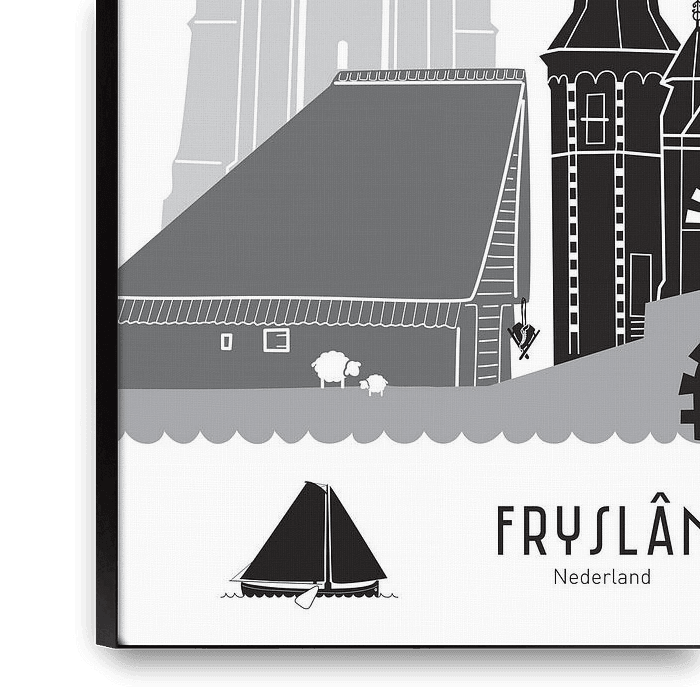 Buy this illustration Skyline illustration province of Friesland in black-and-white-grey by Mevrouw Emmer on canvas, ArtFrame, poster and wallpaper, printed on demand in high quality.