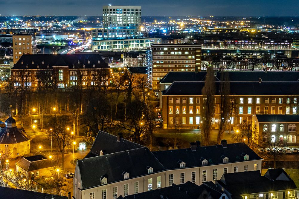 This photo was taken from the Big Tower of Breda during the evening. In the distance you can see the new courthouse. At the left the Spanjaardsgat. And in front you look directly at Brecht's house. That is the white building. There directly behind the site of the Royal Military Academy. The KMA.