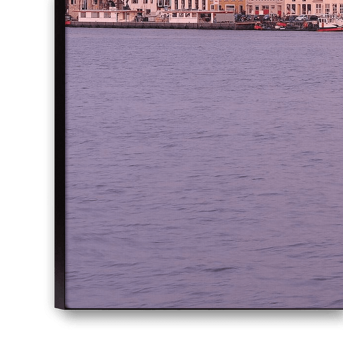 Skyline of Dordrecht with Grote Kerk after sunset. Dordrecht is located where the Merwede splits into the North and Old Maas rivers. In the Middle Ages, the city developed as an important trading city and staple town and was one of the six major cities of Holland. Later, the city's importance declined, but its inner city still recalls this rich past. The Grote or Onze-Lieve-Vrouwekerk church is the largest church in this city. It is a cross basilica in Brabant Gothic style with an unfinished tower. The tower is 65 metres high and is crooked. This is due to the swampy ground. This photo was taken on 14 March 2016.
