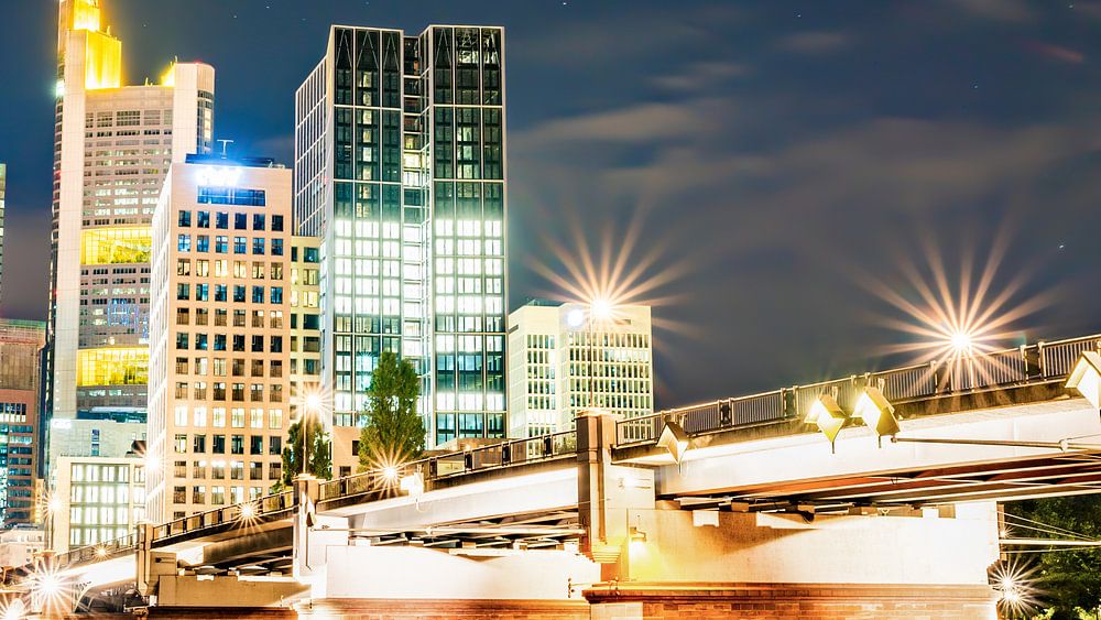 Buy the photo Skyline of Frankfurt at night by Günter Albers on canvas, ArtFrame, poster and wallpaper, printed on demand in high quality.