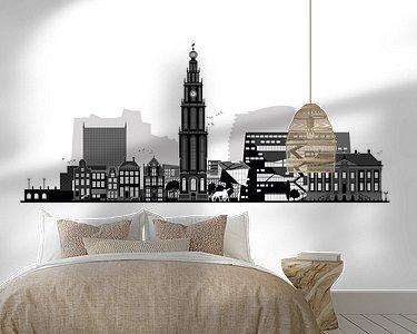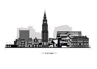 With characteristic buildings such as the Martini Tower, the Raadshuis, the Peerd van Ome Loeks, Groninger Forum, the Drie Gezusters buildings, the Goudkantoor and the Groninger Museum. In the background, the contours of the Gasunie building and Kempkensberg.