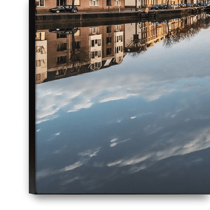 Museum harbour and Leeuwarden's two tallest office buildings mirrored in the rippling city canal