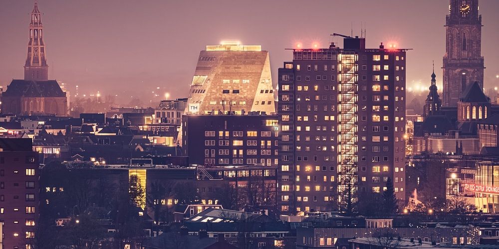 An evening photo of Groningen's skyline in 2:1 format. The view is towards the city centre with the A-Church, Martinitoren and the new Forum building. The photo was taken from the Tasmanian offices.