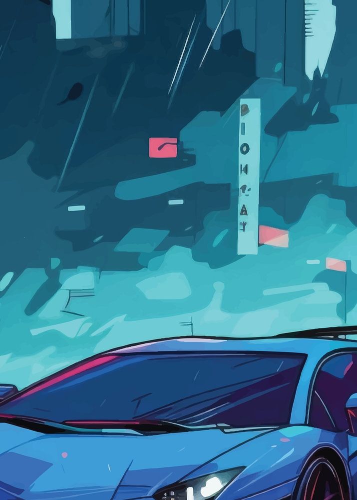 This minimalist poster showcases the timeless design of a Lamborghini against a backdrop of a rainy city. The clean lines and bold colors create a striking visual that is both modern and timeless.