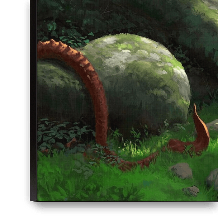 A peaceful scene depicting a sleeping red dragon in a green woodland oasis.