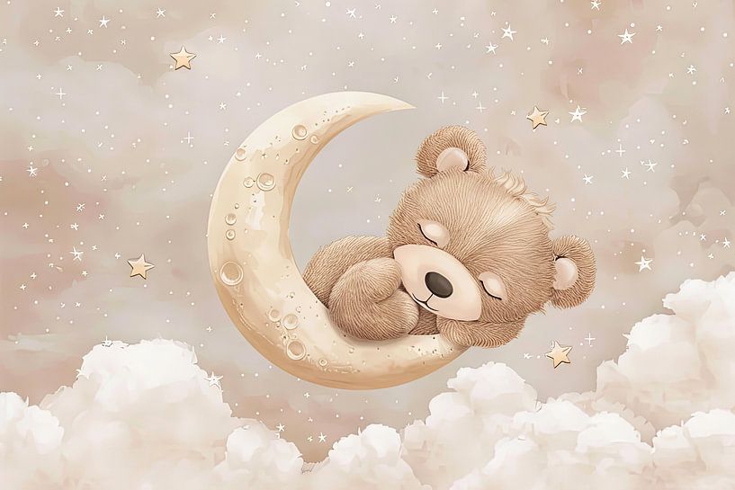 This enchanting wall mural shows a fluffy teddy bear sleeping peacefully on soft clouds under a sparkling starry sky. The soft, pastel-coloured background creates a calming and loving atmosphere, ideal for children's rooms or nurseries. Perfect for parents who want to create a warm and dreamy environment for their little ones. A loving…