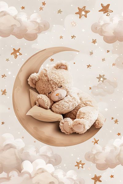 This enchanting wall mural shows a fluffy teddy bear sleeping peacefully on soft clouds under a sparkling starry sky. The soft, pastel-coloured background creates a calming and loving atmosphere, ideal for children's rooms or nurseries. Perfect for parents who want to create a warm and dreamy environment for their little ones. A loving…