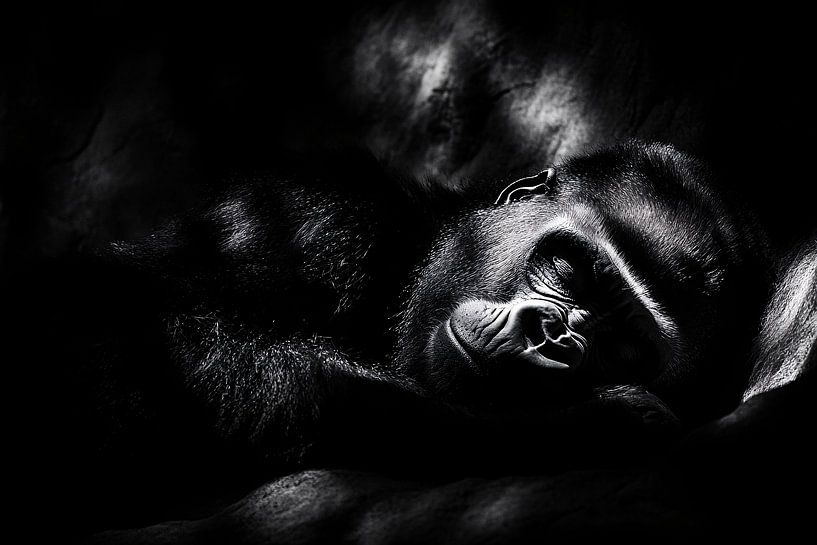 This beautiful black-and-white photograph shows a sleeping gorilla, perfectly captured in a play of light and shadow. The design exudes calm and serenity, while the detailed texture of the fur and the soft contours of the gorilla contribute to an intimate and emotional experience. Ideal for lovers of animal photography and minimalist…