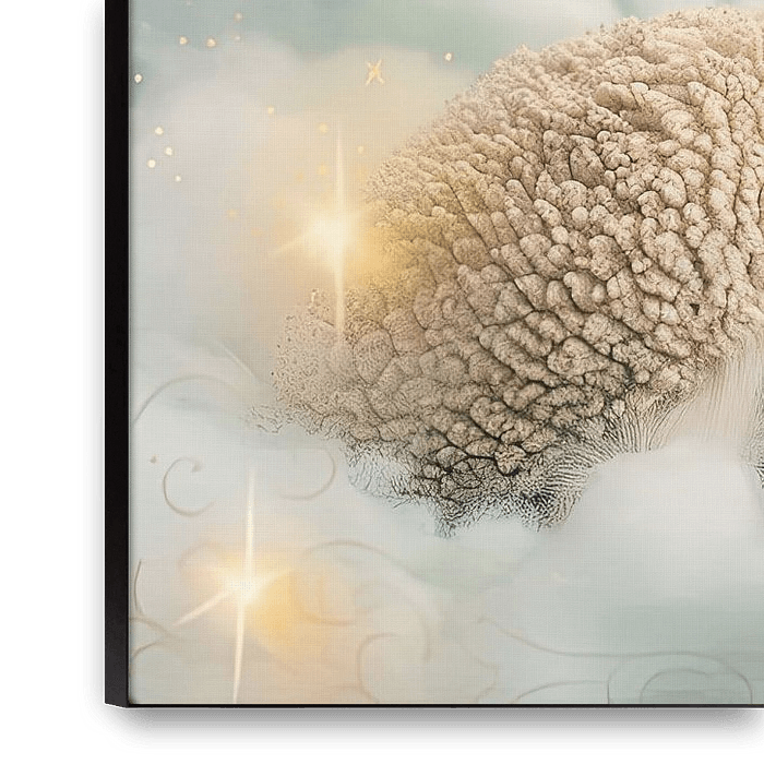This enchanting illustration shows a sleeping lamb, nestled on soft clouds under a twinkling starry sky. The soft, pastel colours and detailed depiction of the stars create a dreamy and calming atmosphere, perfect for a child's bedroom. Ideal for parents looking for a loving and magical wall art to create a peaceful environment for…
