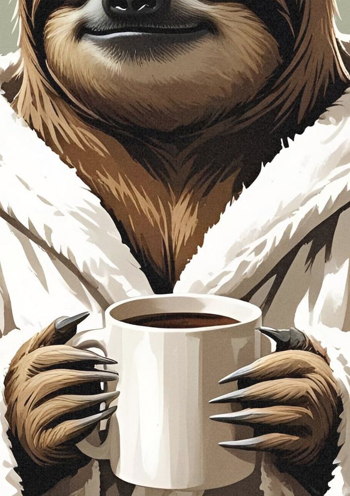 A sloth in a fluffy bathrobe, a large cup of coffee held securely in its claws, its gaze relaxed and slightly mischievous - this motif brings calm and serenity directly to the wall. The warm green tone in the background emphasises the gentle, decelerated aura of the picture.