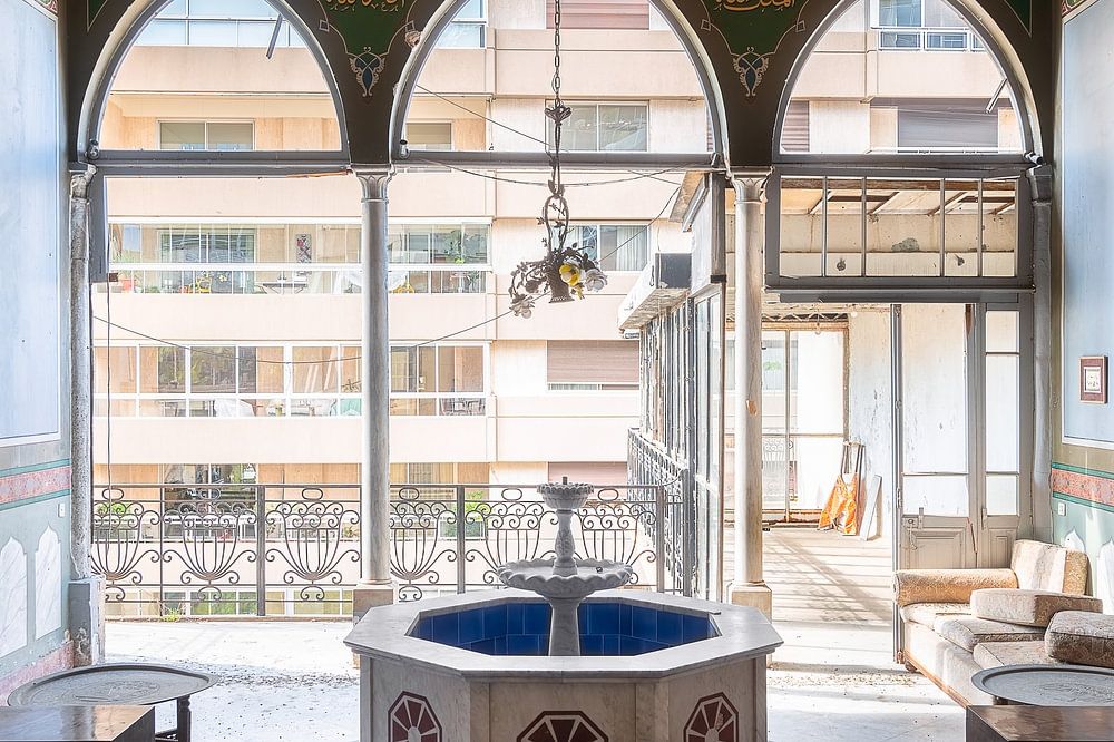 This is a photo of a small fountain standing in the middle of a room in the abandoned Tabbal building in Beirut, Lebanon. Due to the explosion in the port on August 4, 2020, the building was badly damaged. Several initiatives are now trying to ensure that the building is protected and restored to its former glory.