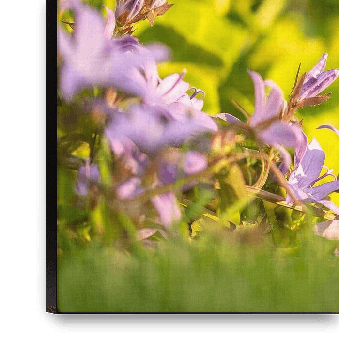 Idyllic scene in a garden with purple flowering Campanula Addenda. Beautifully composed and taken from the lawn, with an empty flower pot in the background.