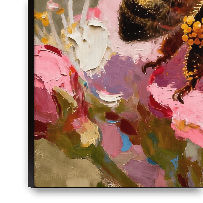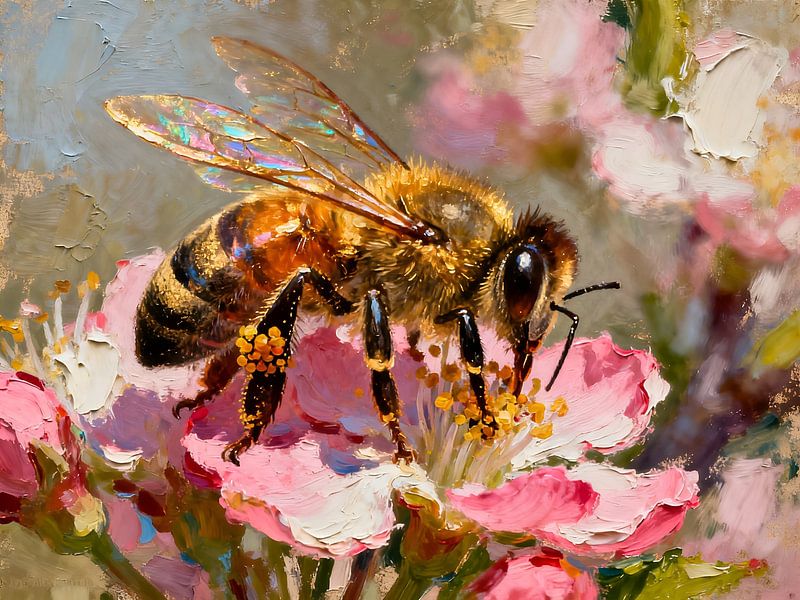 This richly detailed painting depicts a close-up of a bee on a delicate flower. The combination of realistic rendering and painterly texture lends the subject a special depth. The wings shimmer in iridescent colours, whilst the bee’s body is highlighted with warm golden and brown tones. The flower, with its soft shades of pink and…