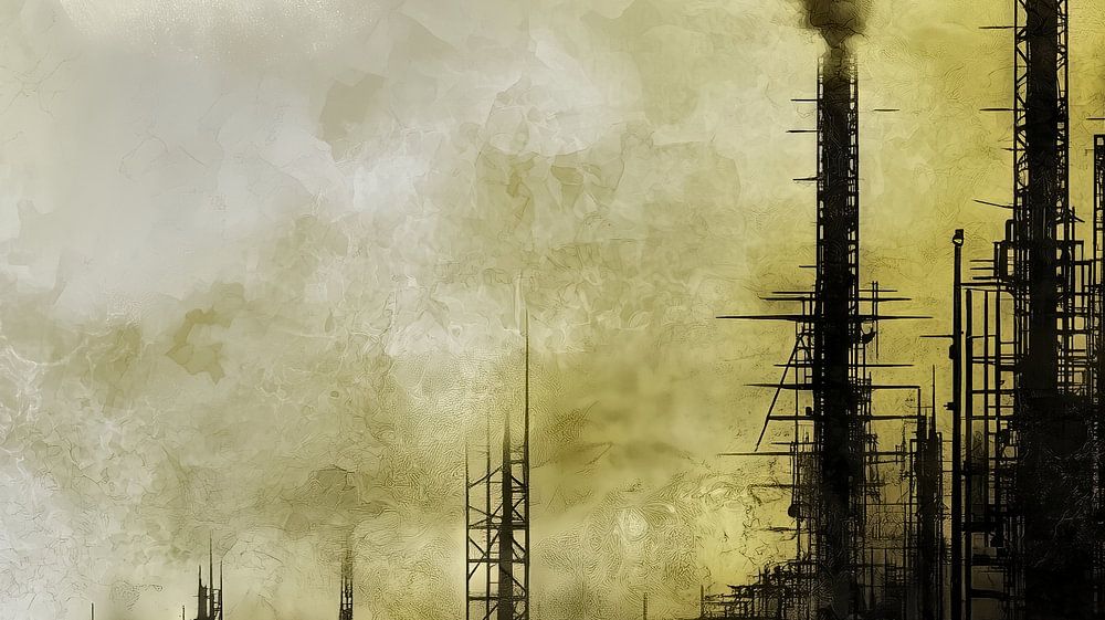 In this impressive illustration, thick smoke rises from several industrial chimneys and darkens the night sky. The smog forms a murky layer that only allows the radiant full moon to shine through dimly. The scene creates an oppressive feeling and thematises the effects of industrial pollution on the environment. The combination of natural moonlight and artificially created smog emphasises the contrast between the untouched beauty of nature and the damage caused by human activity. A haunting image that inspires reflection on environmental pollution and its long-term consequences.