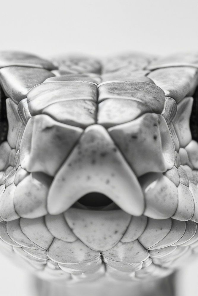 This impressive black and white photograph shows a snake in all its splendour. The sharp details of the scales and the mesmerising eyes captivate the viewer. This photograph showcases the mystical beauty and elegance of this creature and is perfect for lovers of animal photography and minimalist art design. Ideal as a stylish decorative piece in modern living spaces.