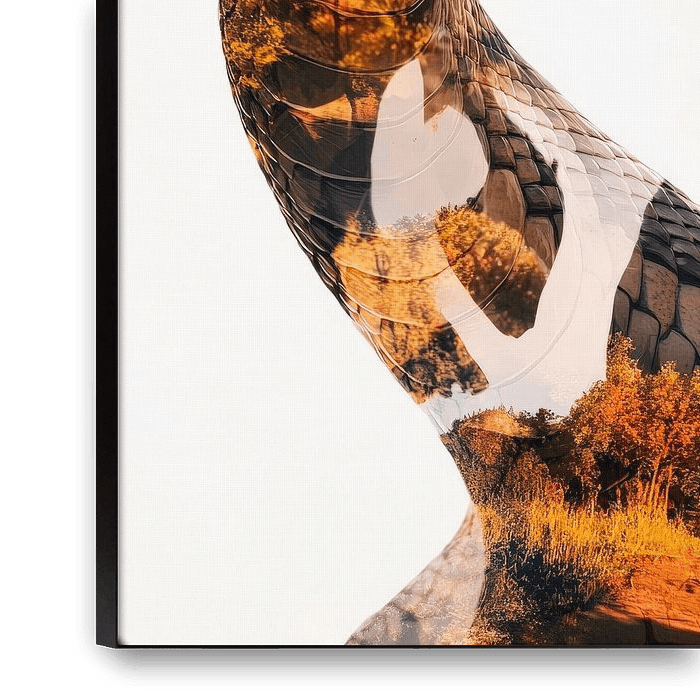 A fascinating interplay of light and nature unfolds in this artistic depiction. The curved body of a snake, interspersed with vivid landscapes, magically attracts the eye. This extraordinary wall decoration lends a mystical touch to any living room and invites you to linger in thought and explore the beauty of nature.